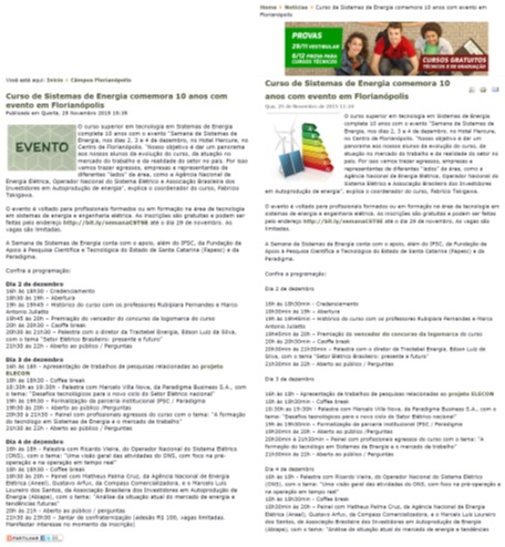 O objetivo desse trabalho é relatar a preparação, execução e avaliação do evento intitulado Semana de Sistemas de Energia realizado nos dias 02, 03 e 04 de dezembro de 2015, em comemoração aos dez anos do Curso Superior de Tecnologia em Sistemas de Energia (CSTSE) do Instituto Federal de Educação, Ciência e Tecnologia de Santa Catarina (IFSC). O evento contou com diversos participantes de diferentes áreas do Setor Elétrico Brasileiro, como por exemplo, representantes da Agência Reguladora de Energia Elétrica (ANEEL), Associação Brasileira dos Investidores em Autoprodução de Energia (ABIAPE), Operador Nacional do Sistema Elétrico (ONS), Tractebel Energia, COMPASS Comercializadora de Energia além de egressos do curso que contaram suas experiências profissionais e relataram sobre o período em que eram estudantes do curso.