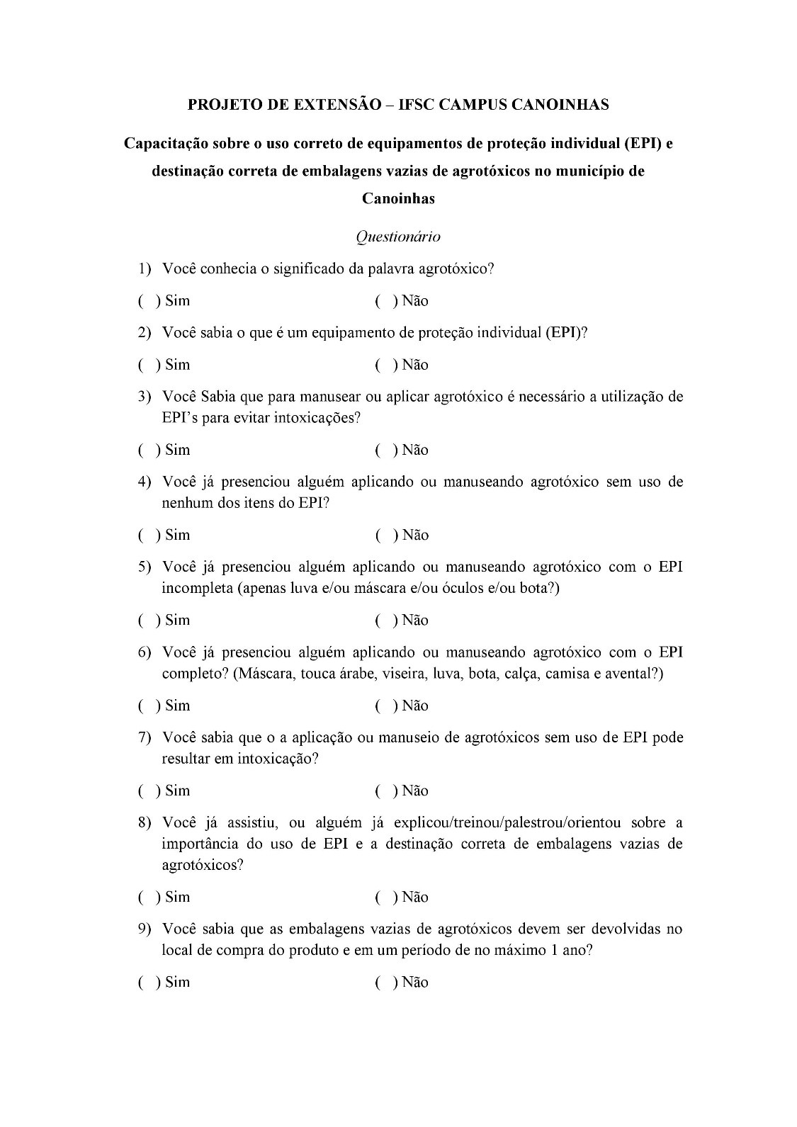 - Figura 1. Questionário sobre o uso correto de equipamentos de proteção individual (EPI) e destinação correta de embalagens vazias de agrotóxicos no município de Canoinhas