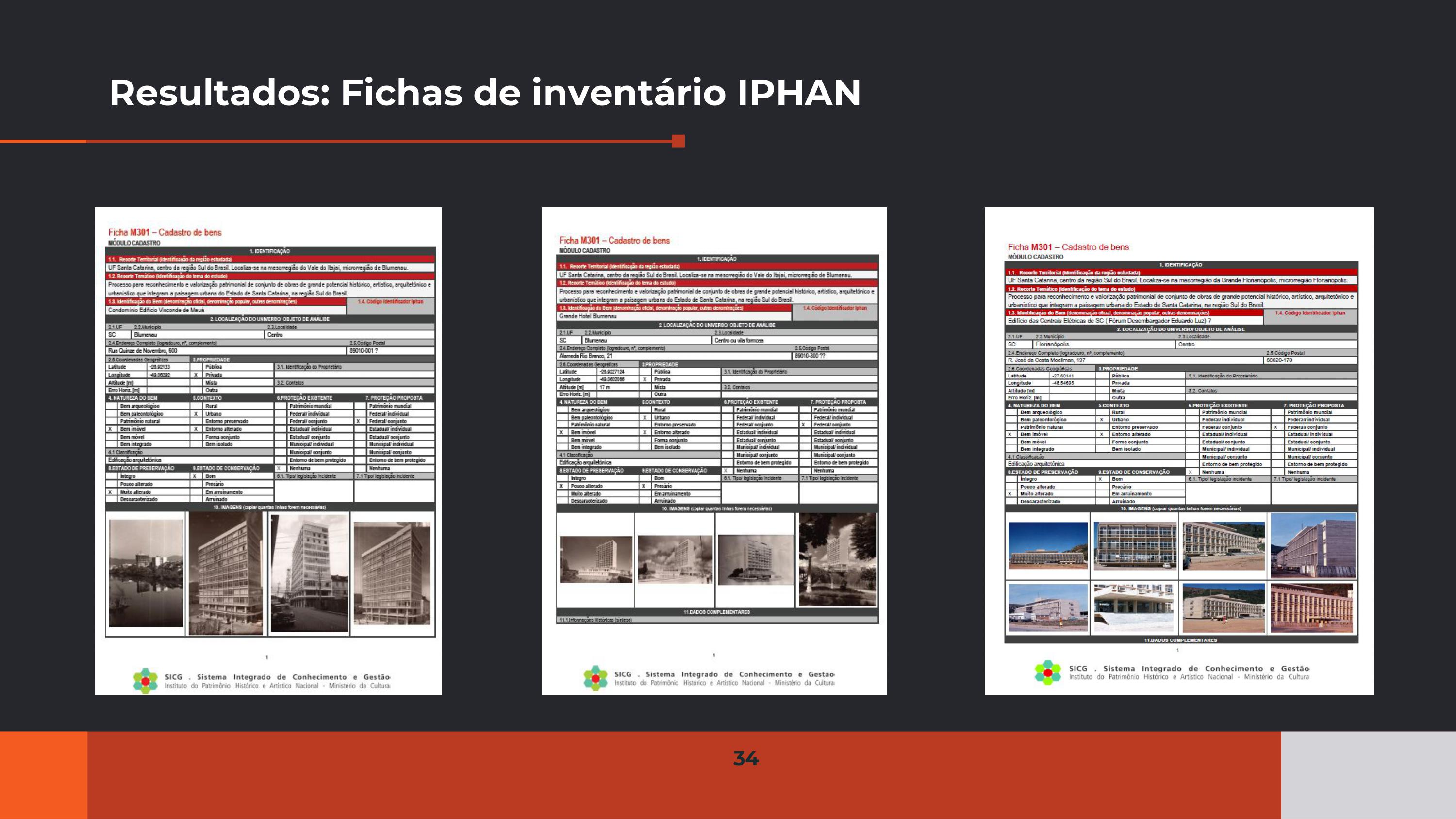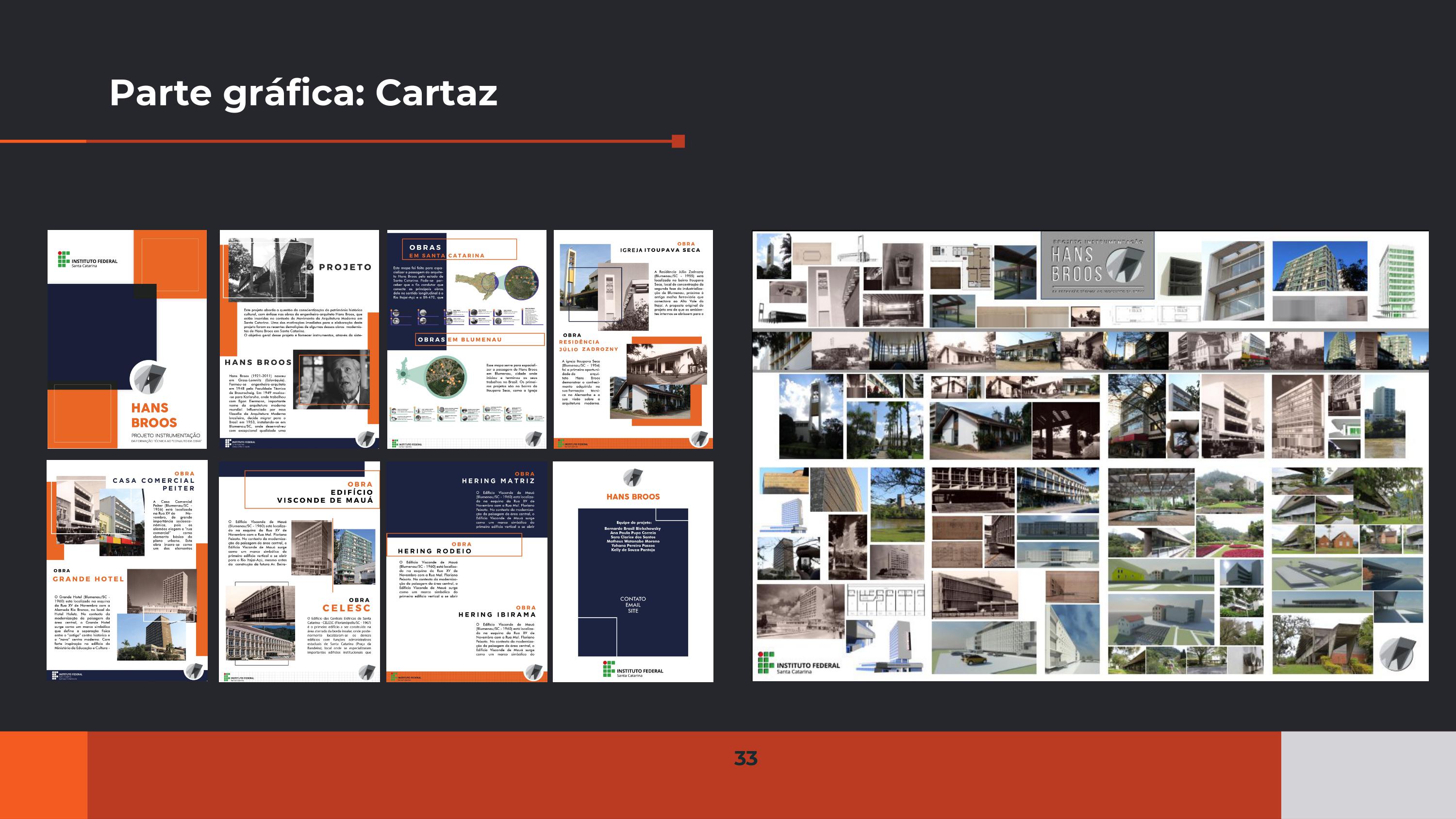 O projeto propôs a articulação da pesquisa e extensão ao ensino, utilizando as obras do arquiteto Hans Broos em Santa Catarina que constam no processo de tombamento em instrução no IPHAN, que foi a instituição demandante externa. A própria comunidade denunciou algumas demolições, que serviram como justificativa para a realização da atividade de extensão. Foi possível inserir a discussão sobre a valorização patrimonial no ensino, com uma equipe multidisciplinar de bolsistas como protagonistas dessas atividades, attavés das atividades de ensino e da apresentação dos resultados do projeto para o público interno e externo ao IFSC, como as instituições de patrimônio (IPHAN, FCC, CAU) e demais universidades que pesquisam no campo acadêmico (UFSC, FURB, UNIDAVI, UNISOCIESC).