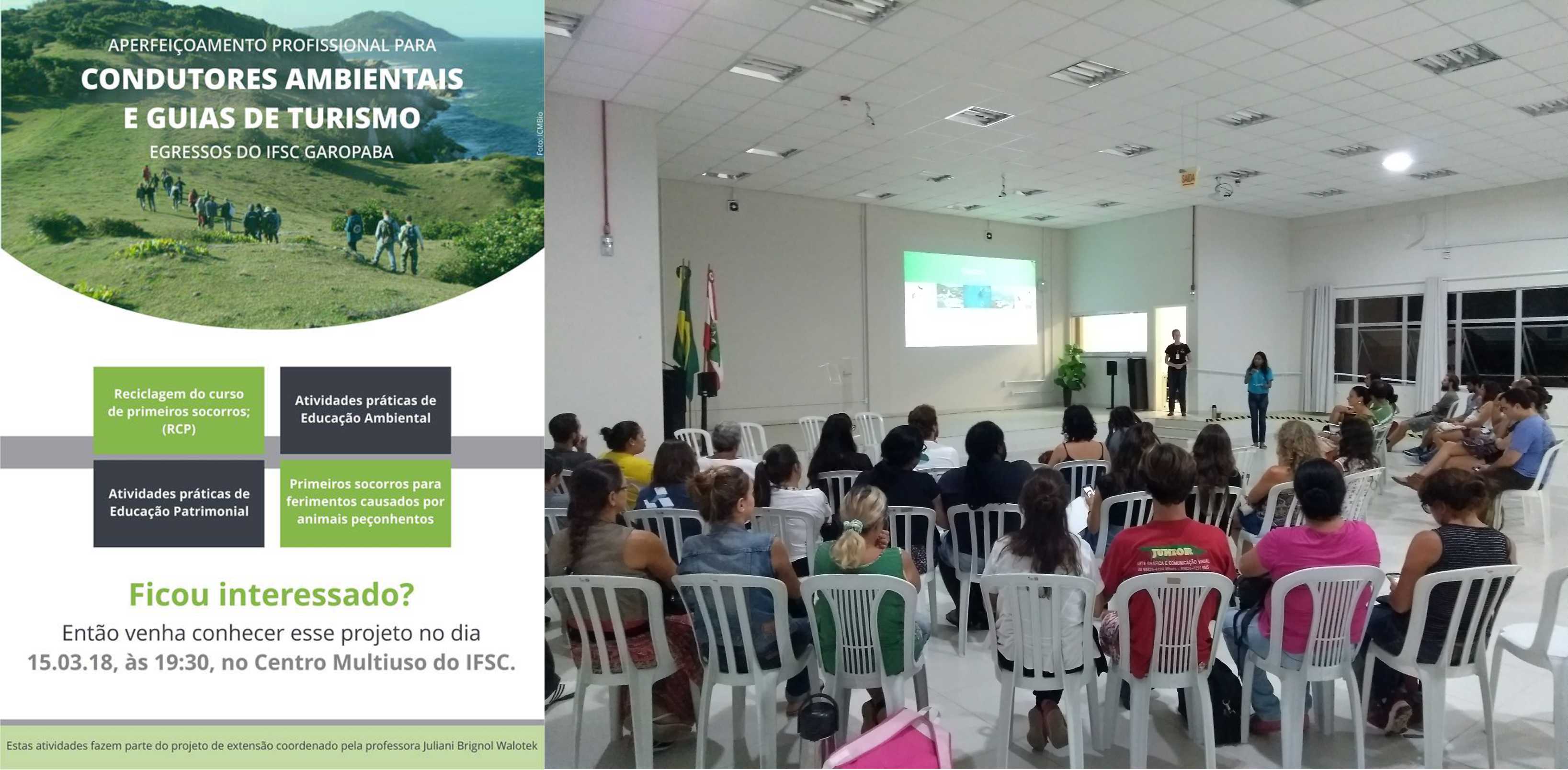 O IFSC Câmpus Garopaba atua na capacitação de Condutores Ambientais e Guias de Turismo que atuam e atendem uma demanda no turismo da região. Os profissionais necessitam de atualização em algumas práticas laborais. Nesse contexto, o projeto objetivou a realização do aperfeiçoamento profissional dos egressos, visitas técnicas e trilhas. Criando um espaço para o debate do desenvolvimento territorial sustentável, estimulando boas práticas voltadas ao bem estar, educação e meio ambiente.