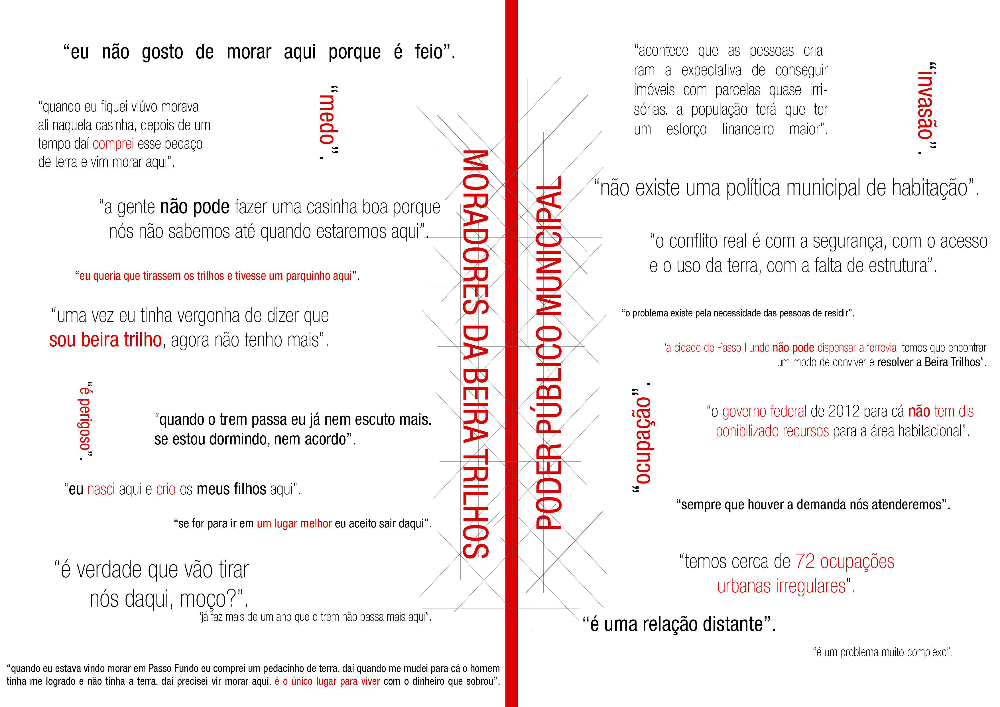 O objetivo do Projeto de Extensão Universitária Beira-Trilhos é buscar alternativas que contribuam para a construção do direito à cidade para as populações das ocupações Beira-Trilhos de Passo Fundo/RS, dando continuidade aos processos iniciados em 2005, com relação aos aspectos jurídicos, urbanísticos e sociais ampliando suas perspectivas e interfaces. Como contribuição para as futuras soluções, foram desenvolvidos estudos de repertorização de casos similares e possíveis alternativas de organização do território. O trabalho busca fomentar a discussão desta temática, comum a diferentes comunidades brasileiras com ferrovias dentro de suas áreas urbanizadas, de maneira transversal nas atividades de Extensão Universitária, e também a partir dos pressupostos de sua articulação com o Ensino e a Pesquisa.